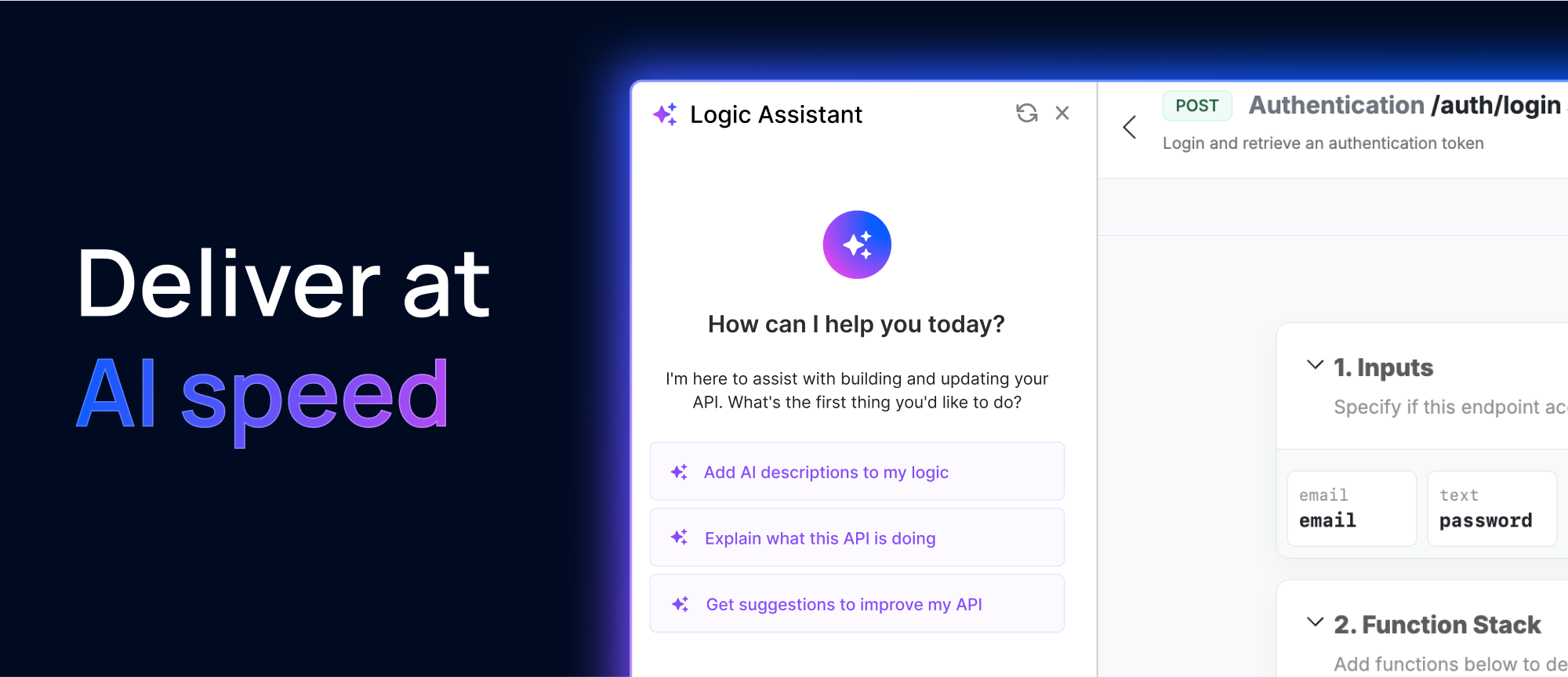 - Logic Assistant: Use this AI-powered builder directly in the Function Stack to describe the logic you want in plain language and generate backend functions instantly.