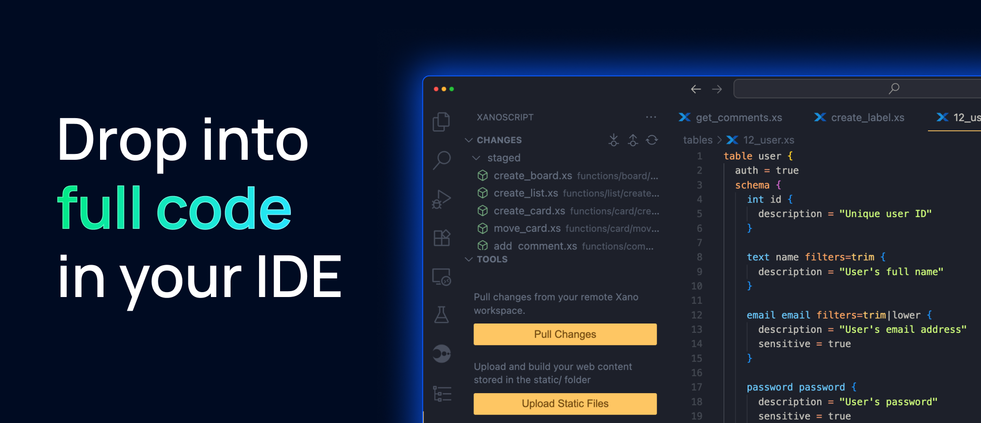 - XanoScript (XS): A new scripting language that lets you write backend logic in code while staying perfectly in sync with Xano’s visual interface. You can write, lint, diff, and version XS in your IDE, right next to your other codebases—a capability no other no/low-code platform supports.