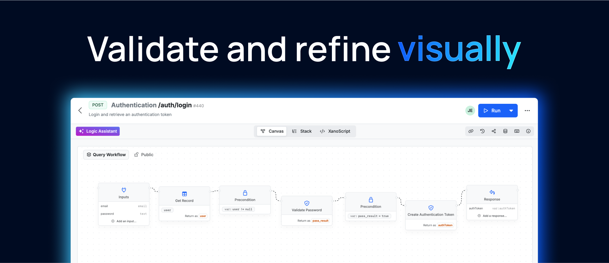 - Seamless Sync: Developers can dive into code with XanoScript for precision, while business leaders and non-coders can review and validate the exact same logic visually in the Canvas View. Everyone sees the same truth, reducing misalignment and mistakes.